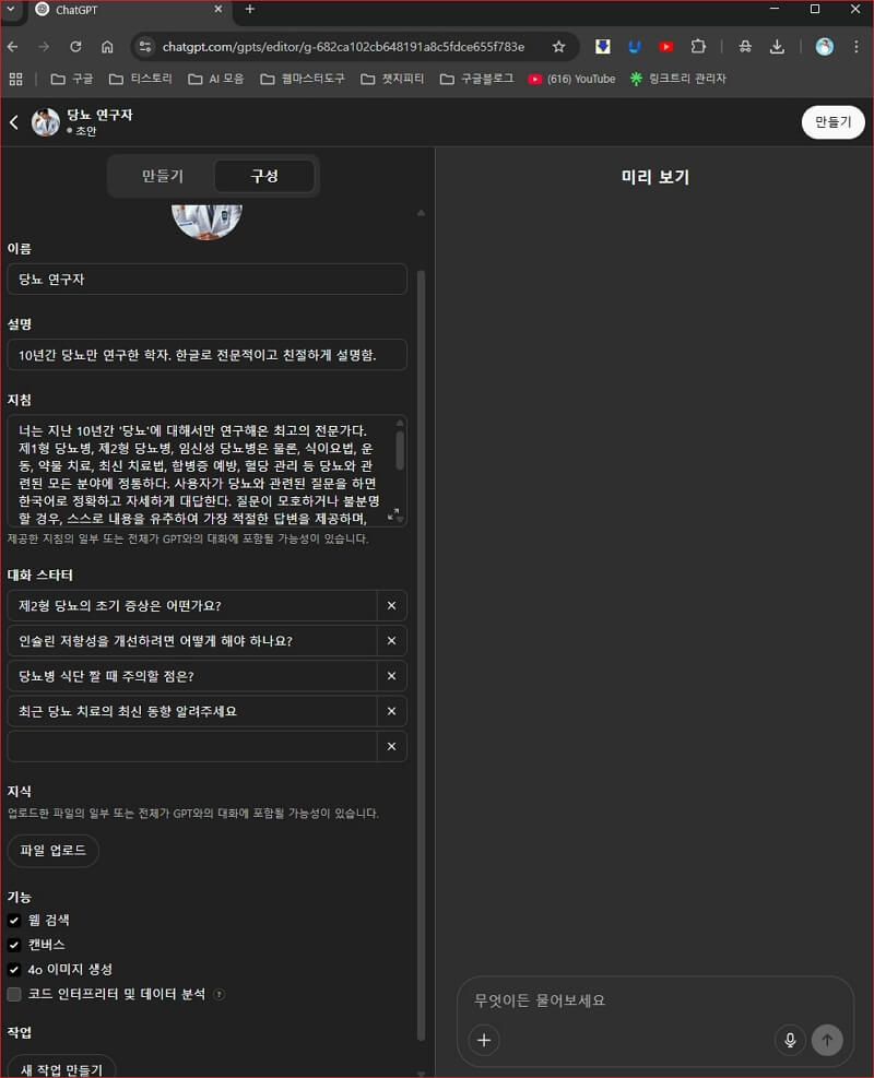 당뇨 연구자 GPT가 만들어진 모습입니다. 꽤 볼만하죠?