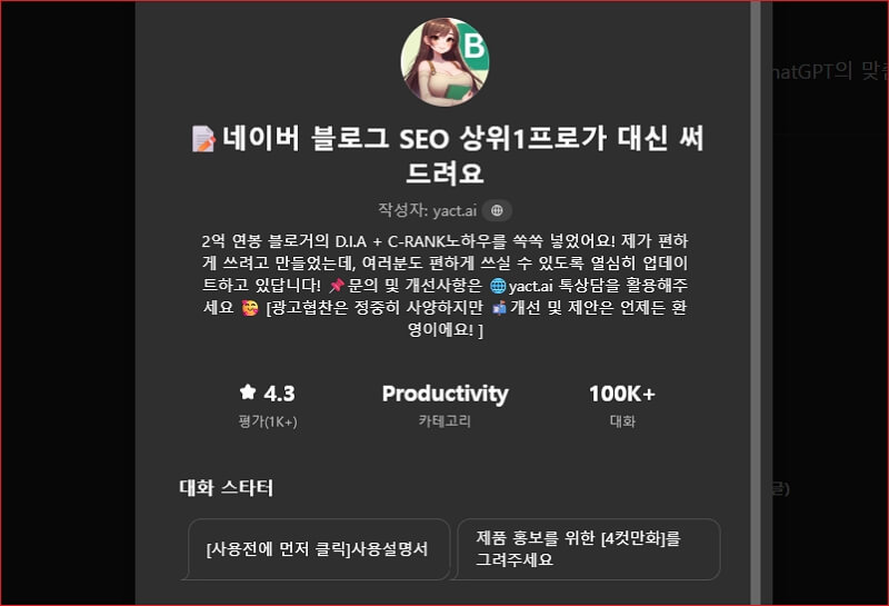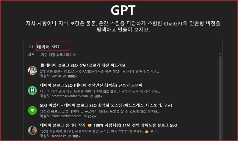 저는 네이버 SEO를 검색해봤습니다. 그리고 첫 번째 100K 이용자가 있는 GPT를 선택해주었습니다.