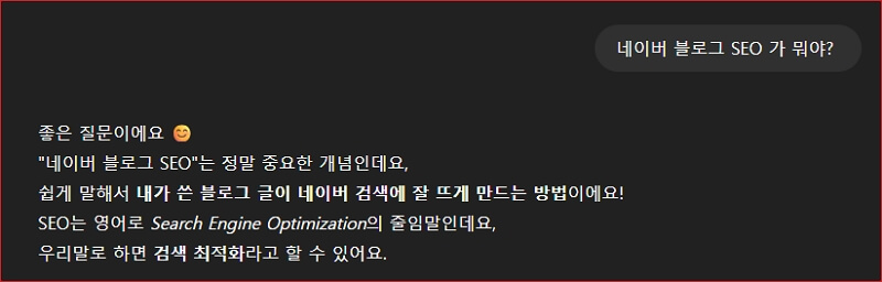 저는 궁금해서 "네이버 블로그 SEO가 뭐야? 라고 물어봤습니다.